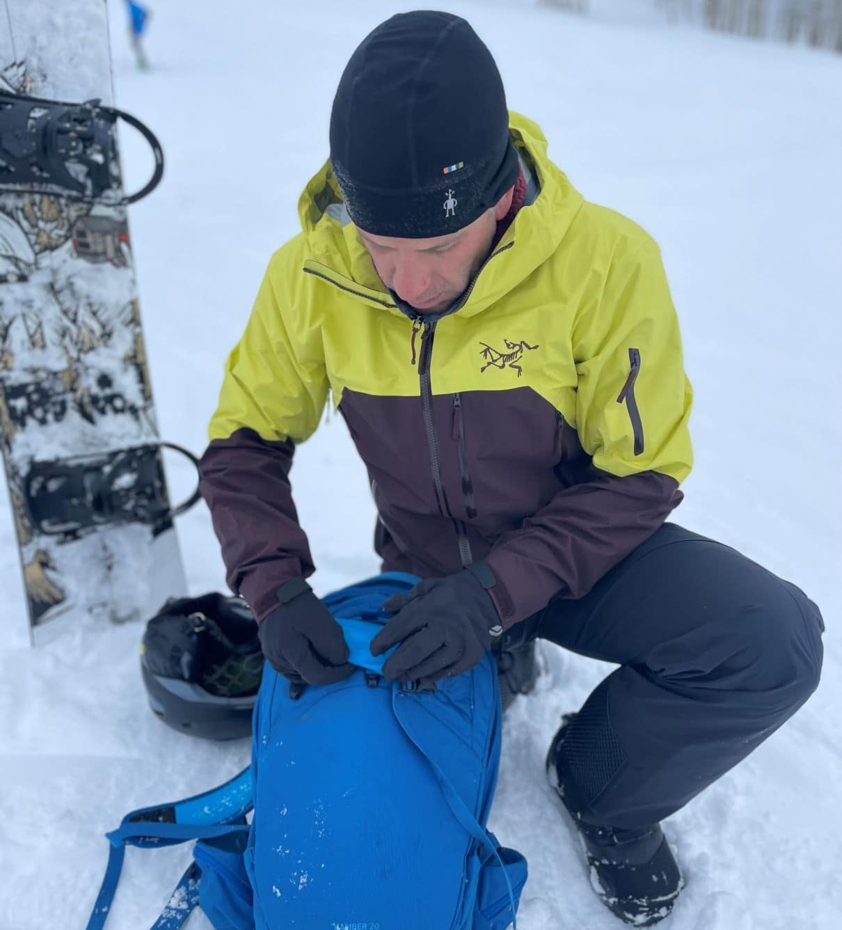 The Arc'teryx Rush jacket (Solaris / Sequoia) and pants (Sequoia) on a big (and snowy) backcountry day on Powder Mountain, British Columbia.